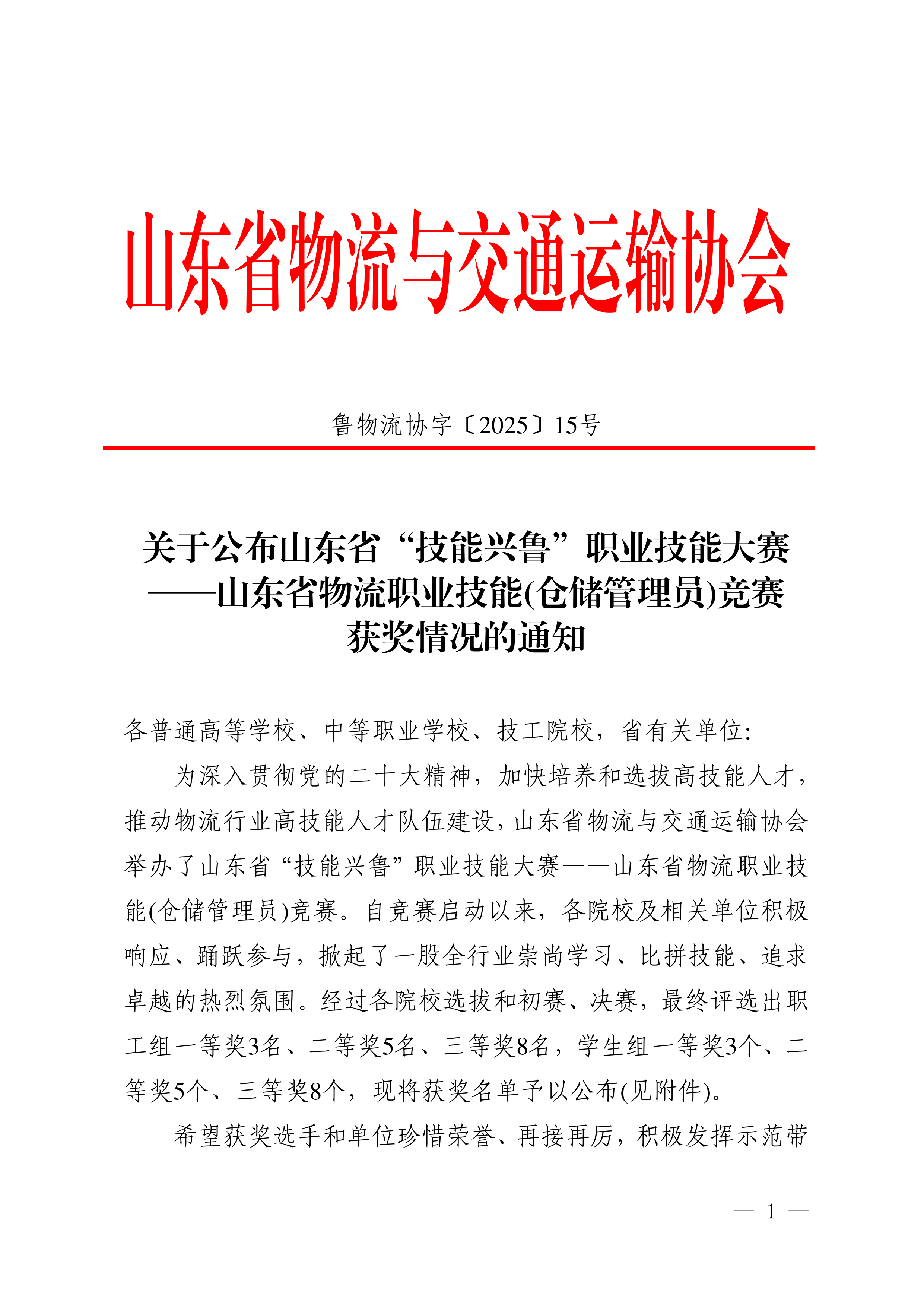 关于公布山东省“技能兴鲁”职业技能大赛——山东省物流职业技能(仓储管理员)竞赛获奖情况的通知
