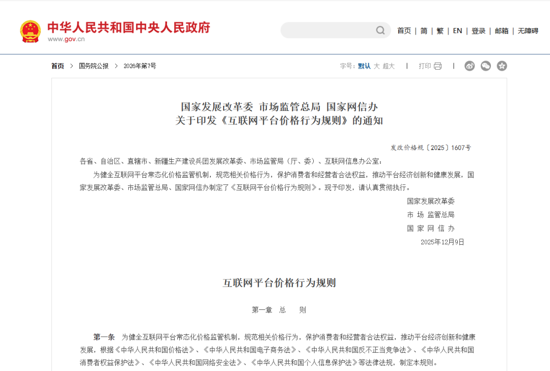 该《规则》于2025年12月正式发布,预留了近4个月的过渡期,供平台经营者对照调整。《规则》规定了平台经营者、平台内经营者实施价格行为应当遵守的规范。主要为三点,一是规范价格竞争秩序;二是保护经营者自主定价权;三是保护消费者合法权益。