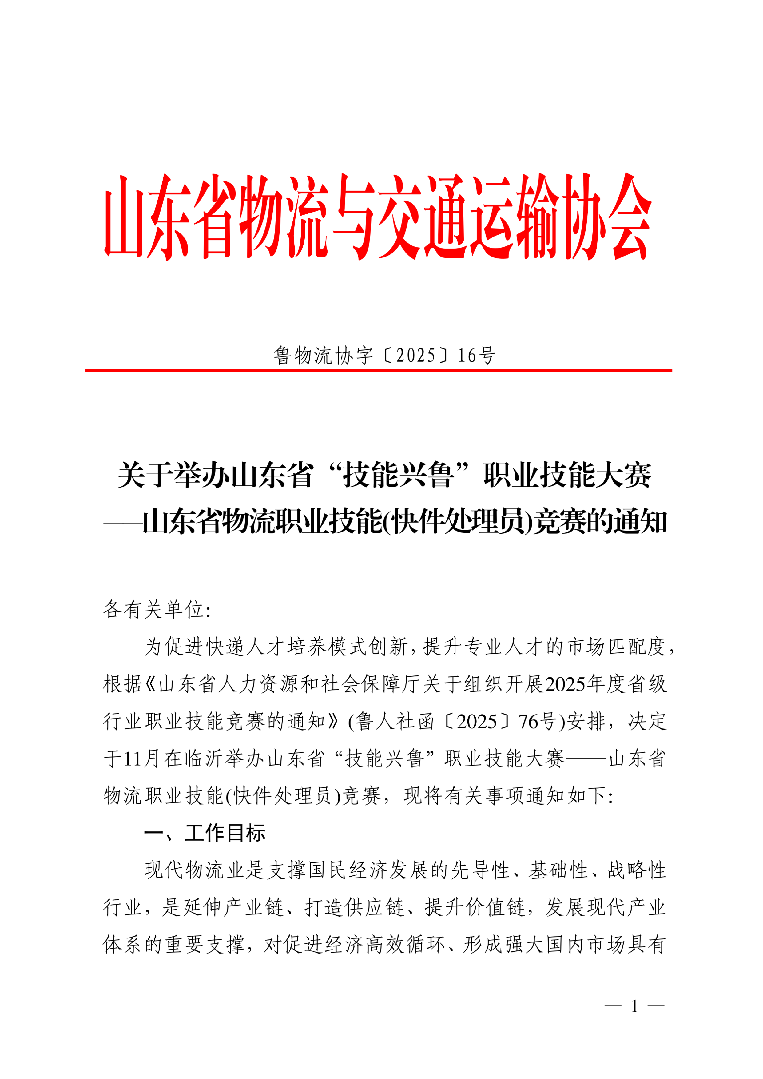 关于举办山东省技能兴鲁职业技能大赛山东物流职业技能(快件处理员)竞赛的通知